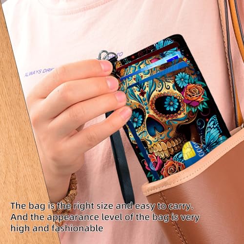 HOT ! Leather Small Slim Wallet Card Case Hold 12 Cards with Wrist Strap & ID Window, Golden Skull Credit Card Holder Wallet Front Pocket, Minimalist Rfid Blocking Wallet for Man Women