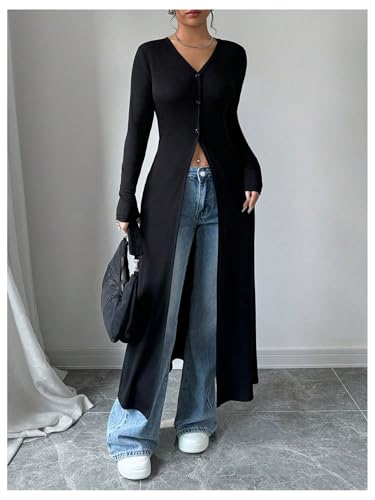 • Features: Long cardigan sweaters for women, button up, open front, long sleeve, v neck, high split, rib knit