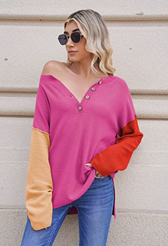 HOT ! Pink Queen Women's V Neck Button Sweater Oversized Batwing Long Sleeve Henley Pullover Knit Jumper Top
