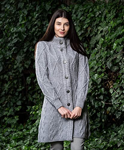 HOT ! SAOL 100% Merino Wool Irish Cardigan for Women with Celtic Knot Buttons -Aran Long Outdoor Cable Knit Coatigan