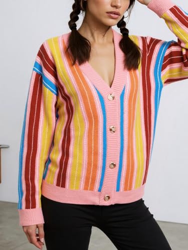 HOULENGS Women's Casual Long Sleeve Rainbow Striped Cardigan Sweaters V Neck Button Down Color Block Knit Loose Sweater Coat 1