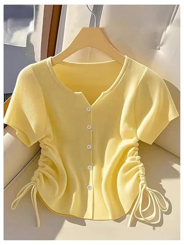 • Stylish knit top for women features a round neck design with short sleeves and a button-down front, accentuated by drawstrings on the sides that allow for adjustable ruching, adding a playful and stylish twist to the garment