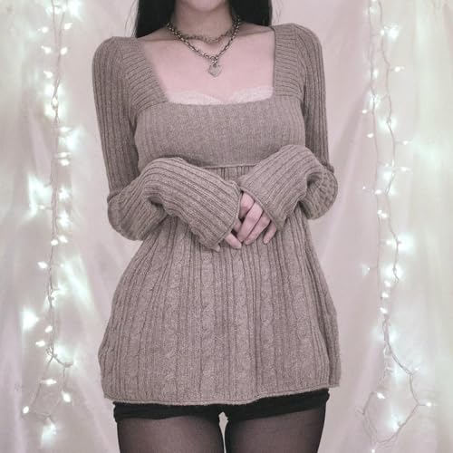 HOT ! Y2K Fairy Tunic Long Sleeve Knitted Tops Square Neck Low Cut Peplum Ruffle Hem Sweater Harajuku Going Out Knitwear