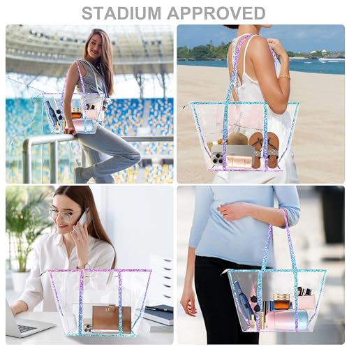 Large Clear Tote Bag for Women Stadium Approved Transparent Tote Bag Set with Shoulder Bag Heavy Duty Waterproof See Through Bag for Concert, Beach, Shopping Pink Teal Glitter Prints 4