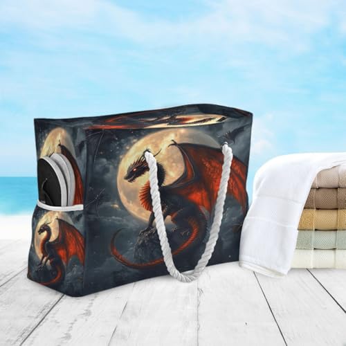 HOT ! Large Beach Bags Totes Canvas Tote Shoulder Bag Red Dragon Water Resistant Bags for Gym Travel Daily