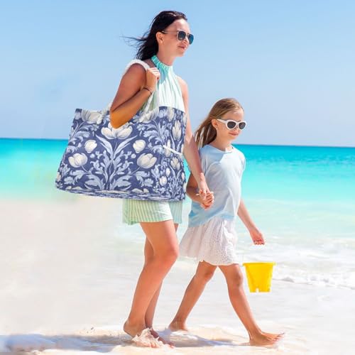 HOT ! Floral Pattern with Blooming Tulips (1) Beach Bag & Travel Tote Bag Large Sandproof with Zipper Closure, Wet Pouch for Swim Gym Travel, Lightweight Foldable Outdoor Bag