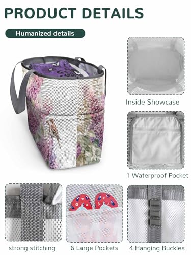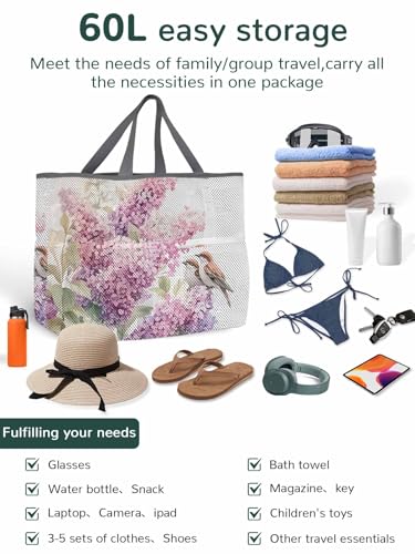 Beach Bags Women Mesh Tote Bag Farmhouse Lavender Sparrow Leaf Toy Grocery Pool Bag with Pockets for Travel/Picnic/Shower 7