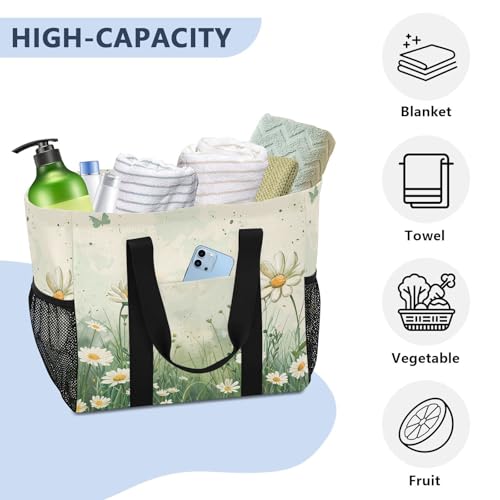 Vintage Spring Daisies Reusable Grocery Bags Large Tote Bag Waterproof Canvas Organizer for Beach Picnic Laundry Travel 7