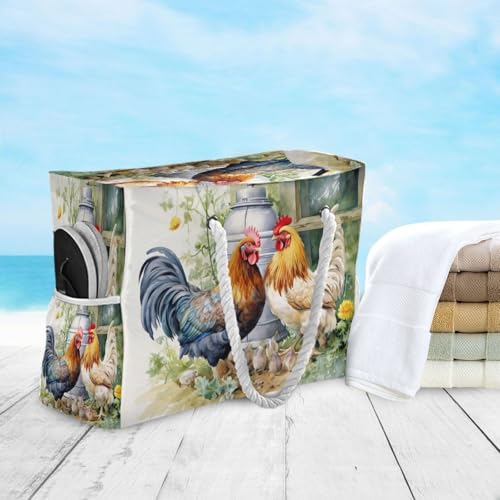 HOT ! Farmhouse Rooster Beach Bag & Travel Tote Bag Large Sandproof Wet Pouch for Gym Travel, Lightweight Outdoor Bag