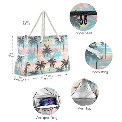 JUNZAN Tropical Pink Green Beach Tote Bag with Handles Beach Totes Bags for Women with Waterproof Pockets 6
