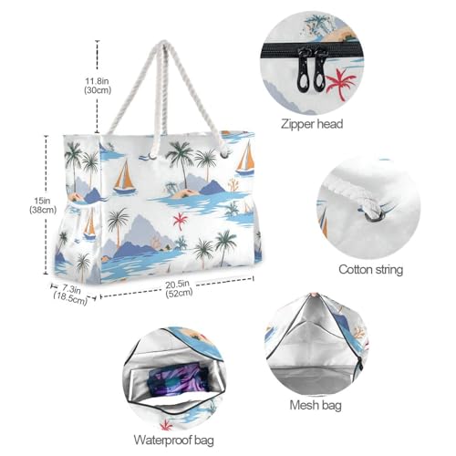 Tropical Seascape Pattern Large Beach Bag, Travel Tote Bag Zippered, Water Resistant Family Size for Seaside, Shower Stall, Swiming Pool 1