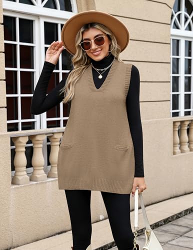 HOT ! Zeagoo V Neck Sweaters for Women Fall Sleeveless Vest Oversized Knit Wear Business Casual Outfit Khaki