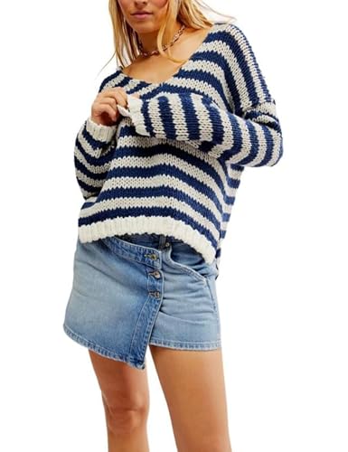 More information about Women's Oversized Striped Sweater Casual V Neck Long Sleeve Color Block Pullover Fall Knit Loose Top