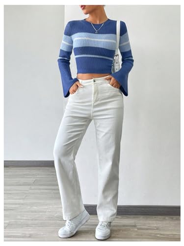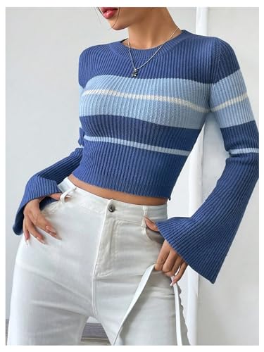 HOT ! SweatyRocks Women's Color Block Striped Sweater Casual Bell Sleeve Crew Neck Cropped Tops Shirts