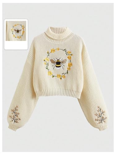 HOT ! Women's Floral Embroidered Drop Shoulder Crop Sweaters Long Sleeve Turtleneck Knit Pullover