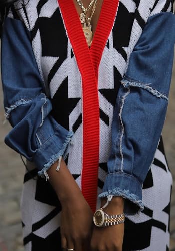 • Features: Long cardigans for women featured with open front, long sleeve with drop shoulder, midi long color block cardigan sweater, knit, star chart printing, spliced denim sleeves, plus size, loose fit. Fall warm knit coat outwear creates slouchy and casual silhouette, below the knee length; trendy and eye-catching sweater coat, flattering and comfy to wear