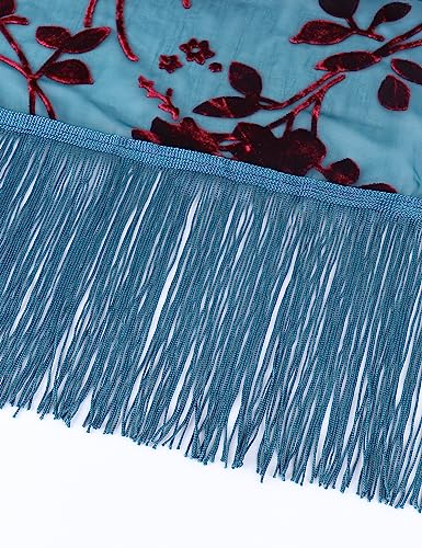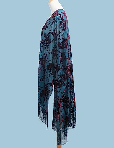 WeHello Women's Burnout Velvet Kimono Long Cardigan Cover Up with Tassel Teal/Red 7