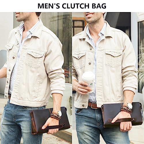 HOT ! Men's Genuine Leather Handbag Travel Clutch with Wristband, Retro Phone Zipper Pouch Wallet, Large Capacity Business Organizer, Crazy Horse Cow Leather Hand Bag Wristlet Purse for Work Travel Coffee
