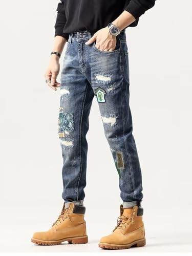 • STYLE: Trendy distressed denim jeans featuring artistic patch details, ripped design elements, and a classic straight leg silhouette