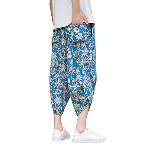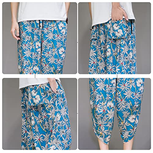 DOSLAVIDA Men's Casual Elastic Waist Linen Capri Pants Wide Leg Baggy Cotton Harem Yoga Trousers Loose Patchwork Short 7
