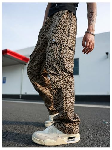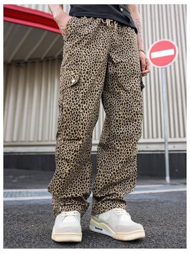 HOT ! GORGLITTER Men's Leopard Print Cargo Pants Baggy Drawstring Waist Flap Pocket Straight Leg Pants