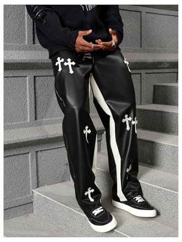 Men's Cross Graphic Hip Hop Pants Punk PU Leather Straight Leg Long Trousers with Pockets 1