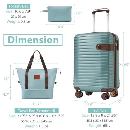 • 3 piece set offers a 20" luggage, a weekender travel bag and a toiletry bag. The 20-inch carry-on luggage meets the size requirements of most airlines - 22x14x9, allowing you to travel worry-free. Perfect for weekend getaways and short trips. 20-inch size:13.9"x 9"x 21.85".