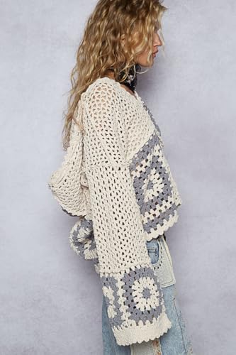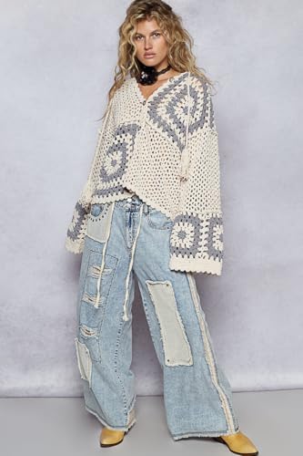 • SLEEVE STYLE: Wide, relaxed-fit long sleeves with decorative gray crochet squares at the cuffs for added visual interest