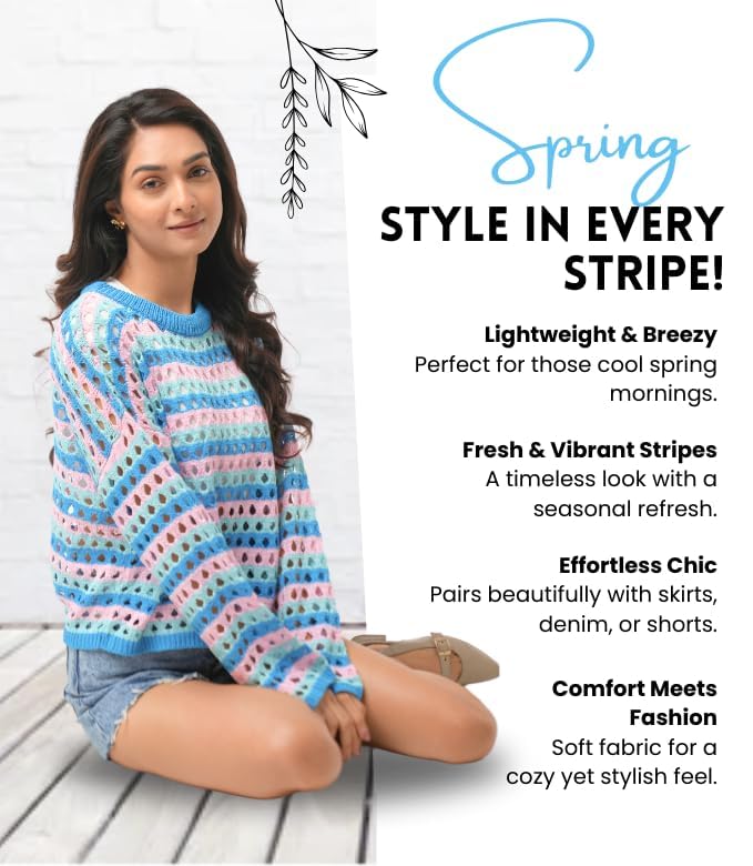 • 𝐔𝐧𝐢𝐪𝐮𝐞 𝐃𝐞𝐬𝐢𝐠𝐧: The beautiful mix of sky blue, pastel pink, and light turquoise gives this mesh sweaters for women a stylish look. It features an open-knit striped design and is made from soft, lightweight acrylic fabric. The crew neck and full sleeves of this mesh sweater add comfort, making this open knit sweater perfect for staying relaxed and fashionable on the go.