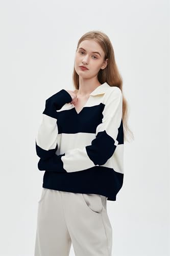 • FEATURES: Stripe pattern knit sweater, Relaxed fit, V neck, Collar neckline, Long sleeves, Slip on style, Slightly cropped. sweaters for women trendy, knit tops for women, womens striped sweater.