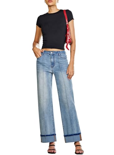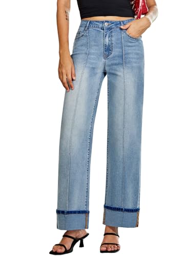 Sidefeel Women's Wide Leg Cuffed Jeans High Waisted Baggy Stretchy Denim Pants with Pockets 1