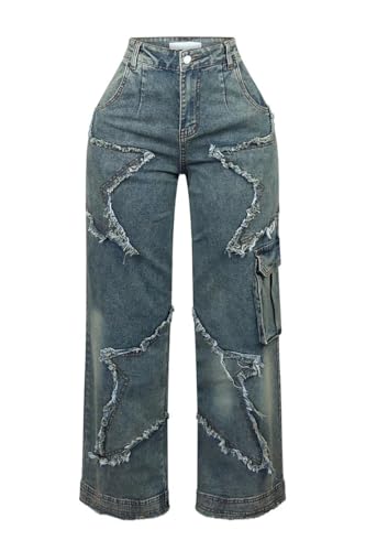 HOT ! Women's High Waist Baggy Ripped Denim Jeans with Star Tassel Frayed Details Y2K Straight Leg Casual Jeans