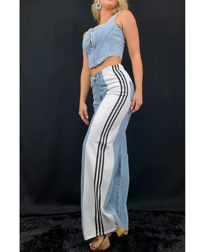 HOT ! Women's Wide Leg Jeans High Waisted Stretch Patchwork Color Block Stripes Loose Straight Baggy Denim Pants