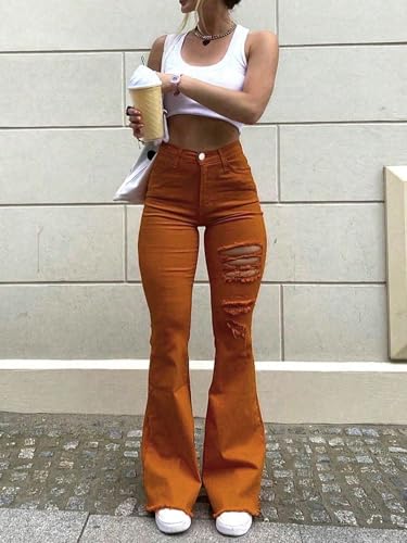 Women's Orange Stretch Ripped Flare Jeans High Waisted Distressed Bell Bottoms Trendy Y2K Frayed Hem Denim Pants 7
