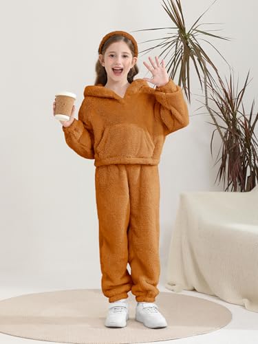 2 Piece Girls Fuzzy Bear Ear Hoodie Sweatshirt and Sweatpant Warm Long Sleeve Fluffy Sweatsuit Kids Clothing Sets 6