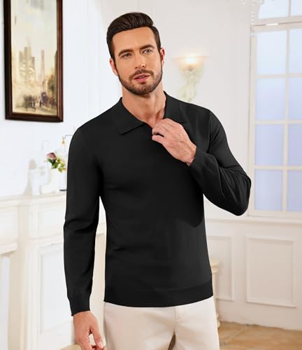 HOT ! Lexiart Mens Knit Polo Shirts Long Sleeve V Neck Breathable Soft Casual Lightweight Solid Color Golf Shirts