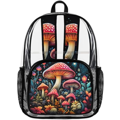 Hand Painted Mushroom Flower Leaf Clear Backpack Stadium Approved PVC Backpacks for Adults Heavy Duty Clear Bag for Work Security Travel College 7