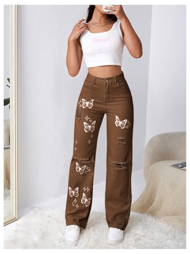 Floerns Women's Ripped High Waisted Butterfly Print Jeans Wide Leg Long Denim Pants 5