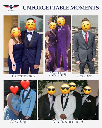 • Hihawk - Refined Elegance, Tailored Confidence: A three-piece slim fit suit set features an exquisite two-button jacket, complemented by a vest and flat-front trousers. Each suit comes with a matching silk tie, flawlessly showcasing your unique style. Available in various sizes and colors for your selection. All internal and external pockets are practical, adorned with refined chrome buttons. Hihawk suits harmonize fashion, comfort, and affordability, striving to meet all your expectations.