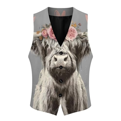 HOT ! Rose Cute Highland Cow Men's Suit Vest Slim Fit Business Dress Party Pattern Waistcoat Vest Top