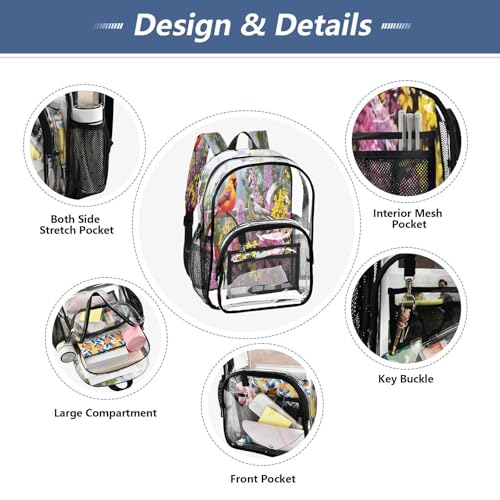 HOT ! Colorful Bird Garden Clear Backpack - Stadium Approved Large 15.7-inch Waterproof Transparent Bag for Sports, Concerts, Work, Travel#151