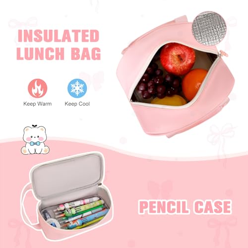 Bevalsa Backpack for Gilrs, Cute Bow School Bags for Kids with Lunch Bag & Pen Case, Bookbag for Girls Children Teens Elementary Middle Student, Back to School Gift with USB Charging Port (Pink) 4