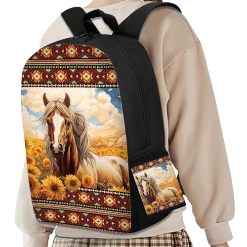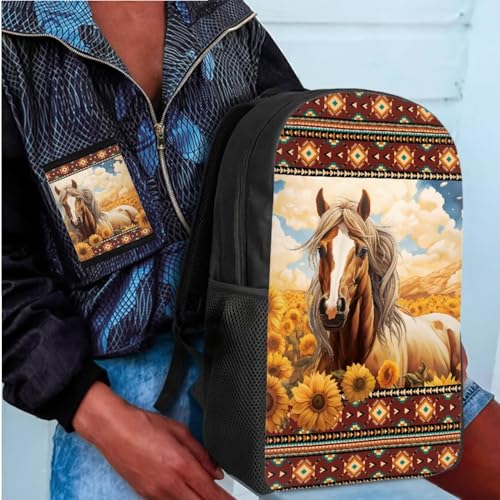 COEQINE Horse Backpacks For Teen Girls Sunflower Book Bag for Women School Bag Set for Student With Trifold Wallet Large Laptop Shoulder Bag With Water Holder Pocket 1