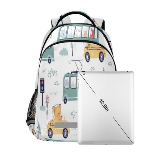 Little Animals Driving Cars Kid's Elementary Middle School Backpack for Son Daughter, Age 6-12 Back to School Backpack Bookbag Schoolbag for Boys Girls 7