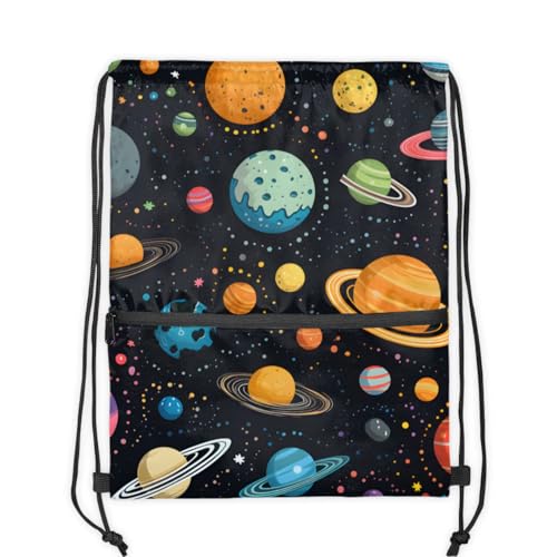 Colorful Planet Pattern Polyester Drawstring Bag with Zipper Pocket, 18x14 Inch Water-Resistant Gym Sack String Backpack for Sports, Travel, Camping 1