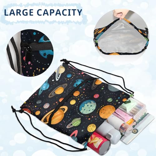 Colorful Planet Pattern Polyester Drawstring Bag with Zipper Pocket, 18x14 Inch Water-Resistant Gym Sack String Backpack for Sports, Travel, Camping 4