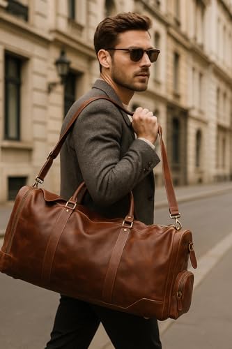 HOT ! The Luxe Leather Handmade Full-Grain Cowhide Leather Duffel Bag – 20" Vintage Travel Gym Weekender with 4 Pockets & Shoulder Strap