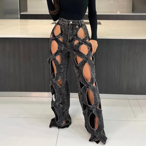 HOT ! Womens High Waisted Jeans Y2K Trendy Hollow Out Criss Cross Wide Straight Leg Baggy Denim Pants Sexy Jean Pants
