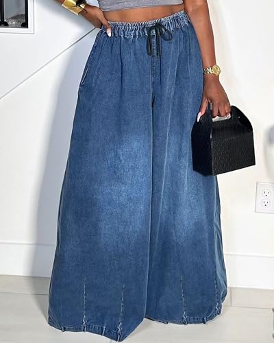 HOT ! Women's Drawstring Wide Leg Jeans Elastic Waisted Loose Fit Patchwork Denim Pants