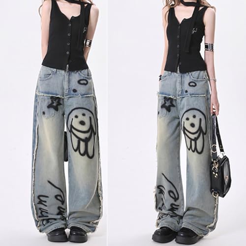 More information about Casual Y2K Straight Wide Leg Jeans Fashion Vintage Gradual Graphic Printing Fringe High Waisted Denim Pants